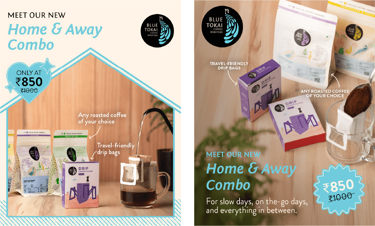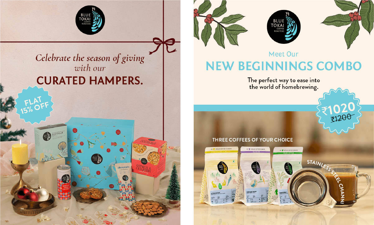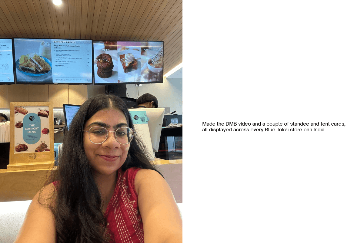 I’m currently working with Blue Tokai Coffee Roasters across both physical and digital touchpoints—my largest brand collaboration to date (and easily my favourite coffee spot)! My work includes DMB screens, tent cards, and standees for their cafés, along with performance ads and website banners. The focus is on clarity, consistency, and ensuring the brand feels cohesive-whether you’re ordering at the counter or scrolling online.